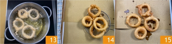 Continuad así sumergiendo pocos aros a la vez 13. Cocinadlos durante unos 3 minutos, girándolos un par de veces, hasta que estén bien dorados. Escurridlos sobre papel de cocina 14. Continuad de esta manera hasta freírlos todos y servidlos aún calientes 15.
