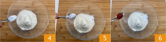 Mientras tanto, preparad la tempura. En un bol verted la harina, la levadura 4, la sal 5 y el pimentón 6.