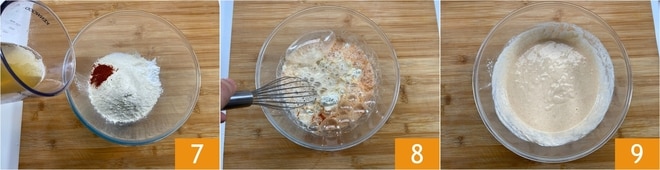 Añadid también la cerveza 7 y mezclad con un batidor 8 hasta obtener una tempura lisa 9. Guardad en la nevera hasta su uso.