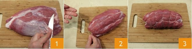 Para realizar el asado con leche, comenzad atando la carne siguiendo las indicaciones que encontraréis en la ficha de la escuela de cocina Cómo atar el asado. Colocad la carne sobre una tabla de cortar, en nuestro caso el corte de ternera, y eliminad el cartílago y la grasa en exceso que podrían endurecerse durante la cocción 1. Luego, con el hilo de cocina, proceded a realizar la malla (2-3).