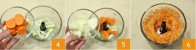 Picad las verduras para el sofrito: poned en una picadora el apio, la zanahoria 4, la cebolla 5, encended la picadora para picarlas finamente 6 y reservad el conjunto de verduras para el sofrito.