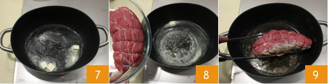 Ahora poned una cacerola amplia al fuego, derretid 30 g de mantequilla 7, colocad el asado 8 y dorad la carne por todos los lados 9.