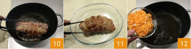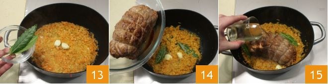 añadid luego 2 dientes de ajo y las hojas de laurel 13. Cuando el sofrito esté bien consumido, unid el asado de ternera 14, rociad entonces con el medio vaso de vino 15, evaporado el cual, salpimentad.