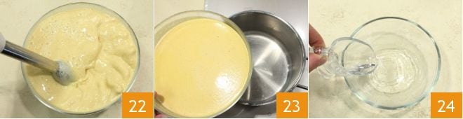 hasta obtener una salsa cremosa 22. Poned la salsa obtenida en una cacerola 23, mientras tanto en un cuenco poned un par de cucharadas de agua fría 24