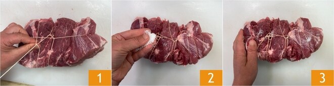 Para preparar el asado de cerdo, lo primero que debes hacer es atar el trozo de carne con hilo de cocina para que mantenga la forma durante la cocción 1; para más detalles puedes consultar nuestra guía "Cómo atar el asado". Sala 2 y masajea la carne para sazonarla uniformemente 3, luego déjala reposar en la nevera durante 30 minutos.