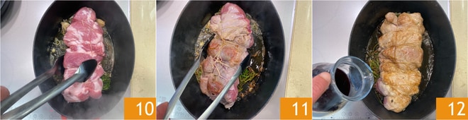 En este punto, coloca la carne en la cacerola 10 y dórala por todos los lados a fuego alto durante un total de unos 5 minutos 11. Desglasa con el vino tinto 12.