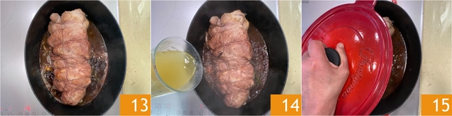 Deja evaporar el alcohol durante unos 5 minutos 13, luego vierte el caldo de carne 14. Cierra con la tapa 15 y cocina durante unos 40 minutos a fuego lento, girando el asado a mitad de cocción.