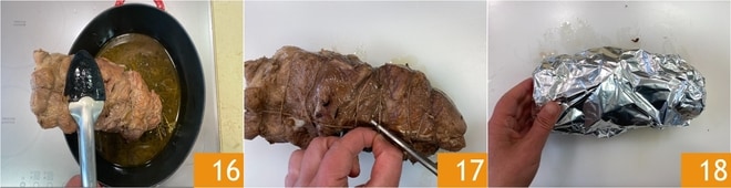 Pasado el tiempo de cocción, retira el asado de la cacerola 16 y quita el hilo 17, luego envuélvelo en papel aluminio para mantenerlo caliente 18.