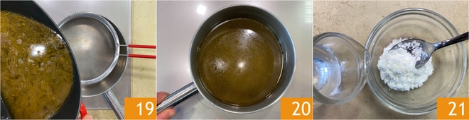 Ahora filtra el líquido de cocción en un cazo 19, luego vuelve a ponerlo al fuego 20 y hazlo reducir a fuego medio hasta aproximadamente la mitad de su volumen inicial; tardará unos veinte minutos. Mientras tanto, en un cuenco aparte, vierte la maicena y un chorrito de agua 21.