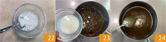 Mezcla bien para disolver completamente la maicena 22. Cuando la salsa esté casi lista, añade la mezcla al cazo 23 y mezcla durante un par de minutos, luego apaga el fuego. Debes obtener una consistencia que cubra la parte posterior de la cuchara 24; si la salsa resulta demasiado densa, puedes aligerarla con un poco de caldo.