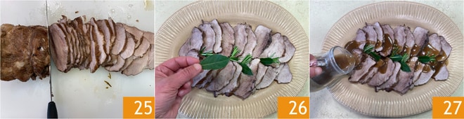 Estás listo para emplatar: corta la carne en rodajas 25 y colócalas en una fuente, luego adorna con hierbas aromáticas al gusto 26. Rocía con la salsa de vino tinto 27 y sirve inmediatamente tu asado de cerdo.