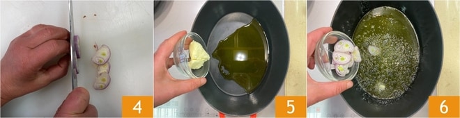 Pasado el tiempo de reposo, limpia la chalota y córtala en rodajas 4. En una cacerola, vierte el aceite y la mantequilla 5. Cuando la mantequilla se haya derretido, añade la chalota 6.