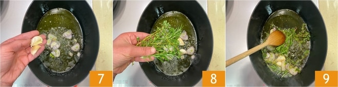 Añade también los dientes de ajo machacados 7, las ramitas de tomillo y romero 8, luego sofríe a fuego medio durante unos minutos 9.