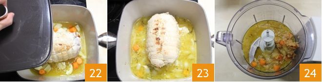 Cubre la olla con una tapa 22 y deja cocinar durante 1 hora y 30 minutos, girando el asado de vez en cuando, hasta que las verduras del fondo estén guisadas y ablandadas y el asado esté firme y bien dorado 23. Cuando el asado haya alcanzado la cocción, transfiérelo a un plato para que se enfríe, vierte las verduras junto con el fondo de cocción en una batidora 24.