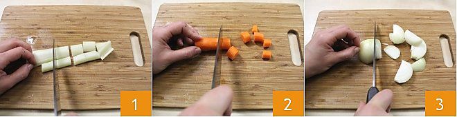 Para preparar el asado frío de pavo, comienza lavando y cortando las verduras para el fondo. Pela el apio y córtalo groseramente 1, lava las zanahorias, pélalas y córtalas en rodajas de aproximadamente 2 cm de grosor 2. Finalmente, limpia y rebana la cebolla 3 y deja todo a un lado.