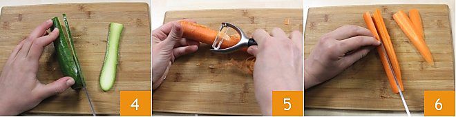 Ahora ocúpate de las verduras para el relleno: lava los calabacines con cuidado, sécalos y córtalos en rodajas de medio centímetro de grosor a lo largo 4. Ahora enjuaga y limpia las zanahorias, pélalas con un pelador 5 y córtalas longitudinalmente en rodajas de medio centímetro de grosor 6.
