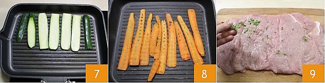 Luego calienta una parrilla y, una vez caliente, asa las rodajas delgadas de calabacín 7 y zanahoria 8 por ambos lados hasta que estén ligeramente asadas pero suaves. Luego pasa a la composición del asado: coloca la loncha de pavo sobre una tabla de cortar y aromatízala con sal, pimienta al gusto y hojas de tomillo 9.