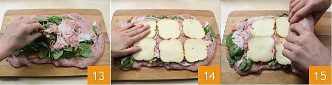 Agrega también las lonchas de jamón cocido 13 y después de cortar la provola ahumada en rodajas finas, colócalas sobre las otras capas 14. Luego comienza a enrollar delicadamente la loncha de pavo, presionando bien con las manos para evitar que el relleno se salga 15.