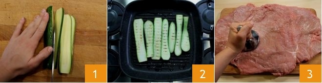 Para preparar el rollo con jamón, fontina y calabacines a la parrilla, preparad el Caldo de verduras que necesitaréis para cocinar la carne; luego lavad y recortad los calabacines, y cortadlos en rodajas regulares de medio cm de grosor aproximadamente 1 y asadlos en una parrilla de hierro caliente 2, por ambos lados. Luego, golpead la carne de ternera para hacerla más tierna y fina 3.