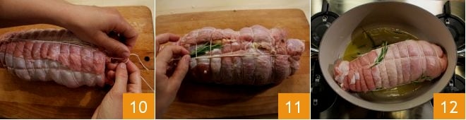 Finalmente, asegurad todo con un nudo en el extremo de la carne y atad el hilo en el otro extremo 10. Aromatizad con una ramita de romero 11. Luego, preparad el condimento del rollo: cortad en trozos grandes la zanahoria, el apio y la cebolla pelada. En una cacerola ovalada, verted el aceite, caliéntalo y luego colocad el rollo 12 y doradlo girándolo de tanto en tanto para un dorado uniforme.