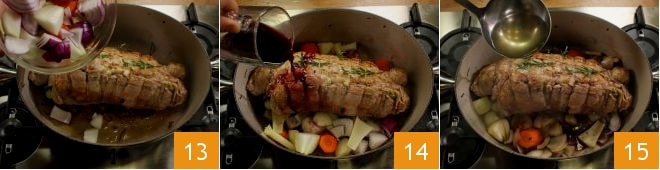 Agregad las verduras cortadas en trozos grandes 13, luego rociad la carne con el vino tinto 14 y dejad que se evapore. Después, verted un par de cucharones de caldo de verduras 15 y tapadlo con la tapa. Cocinad el rollo durante aproximadamente 1 hora y media a fuego muy lento, continuando a verter caldo de verduras de vez en cuando y girando el asado para una cocción uniforme.