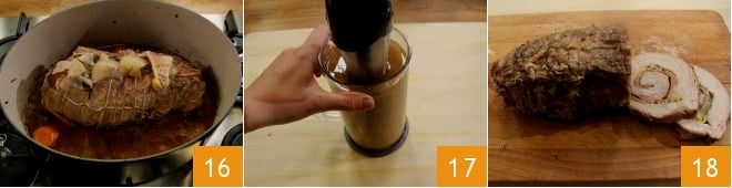 Una vez cocido, apagad el fuego y sacad la carne, colocadla sobre una tabla para que se enfríe. Verted el jugo de cocción y las verduras en un recipiente alto y triturad todo con una batidora de mano para obtener una crema 17: esta será la salsa con la que podréis condimentar la carne. ¡Cortad la carne 18 y condimentadla con la salsa antes de servir!