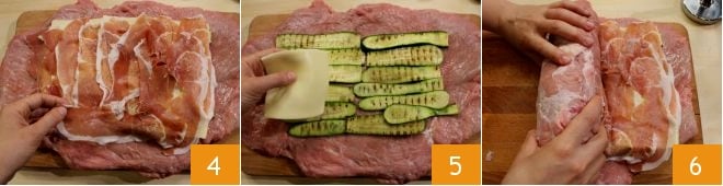colocad las lonchas de jamón, los calabacines a la parrilla y las lonchas de fontina 5 (también podéis empezar por los calabacines, lo importante es que el fontina esté entre las dos capas de ingredientes), luego enrollad la carne sobre sí misma comenzando por uno de los lados más cortos 6.