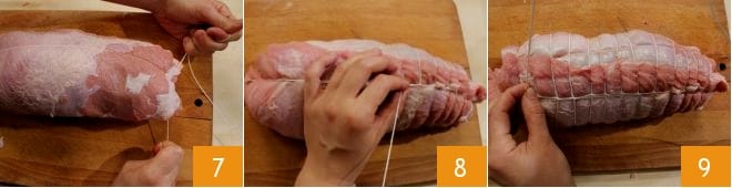 Cómo atar el asado con hilo de cocina de este modo: pasad el hilo primero por debajo y luego por encima de la carne, a lo largo, asegurando bien los extremos del hilo 7 y dejando una parte del hilo ligeramente más larga. Con la parte más larga del hilo, procede regresando por el lado opuesto, mete la mano en el lazo y da un par de vueltas a la cuerda, luego pasa la carne por el lazo obtenido. Asegura bien la base del nudo apretando el anillo creado alrededor de la carne y tirando ligeramente del hilo hacia arriba para apretar el nudo. Completa la "jaula" repitiendo esta operación hasta terminar de atar toda la longitud de la carne (8-9).