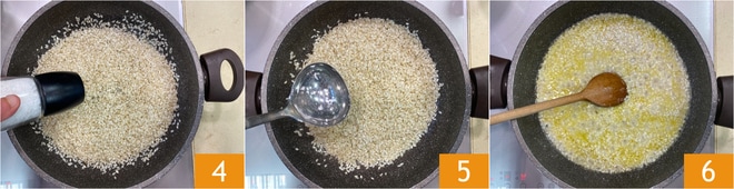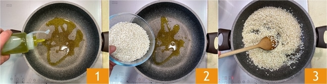 Para preparar el arroz al azafrán al horno con speck y brie, primero llevad a ebullición una olla de agua que utilizaréis para cocer el risotto. Calentad el aceite en una sartén 1, luego verted el arroz 2 y tostádlo durante unos minutos, removiendo a menudo, hasta que esté caliente al tacto 3.