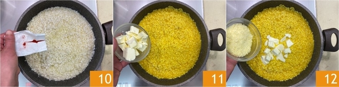 Después de 10 minutos, añadid el azafrán 10 y mezclad bien, luego terminad de cocer el arroz. Cuando el risotto esté listo, apagad el fuego y mezclad con mantequilla fría en cubos 11 y Parmigiano Reggiano DOP rallado 12.