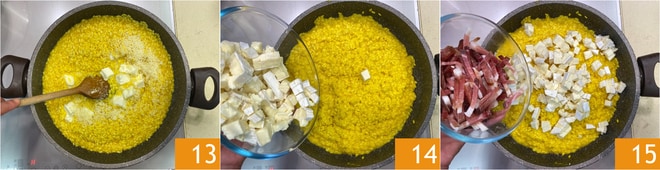 Dejad reposar durante un minuto antes de mezclar bien todo 13. Si quedara demasiado seco, podéis añadir un poco más de agua. En este punto, añadid el taleggio 14 y el speck 15.