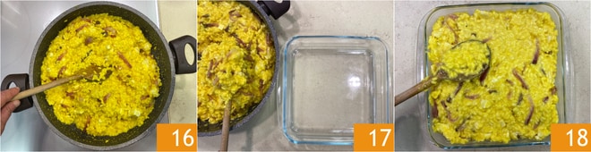 Mezclad bien 16, luego transferid el risotto a una fuente de horno de 24x24 cm 17 y nivelad la superficie 18.