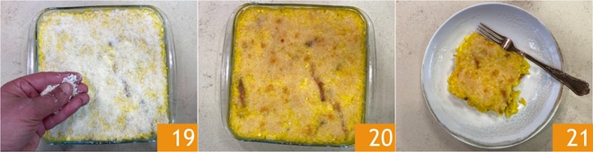 Espolvoread la superficie con abundante queso rallado 19 y coced en el horno estático precalentado a 230° durante unos 20 minutos. Cuando la costra esté crujiente y dorada, sacad del horno 20 y dejad reposar el gratinado durante unos minutos. ¡Vuestro arroz al azafrán al horno con speck y brie está listo para ser servido 21!