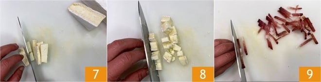 Mientras tanto, cortad el taleggio primero en rodajas 7 y luego en dados 8. Cortad el speck en tiras 9.