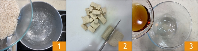 Para preparar el arroz basmati con tofu a la soja y verduras salteadas, en primer lugar echad el arroz en abundante agua salada 1 y cocedlo el tiempo que indique el envase. Mientras tanto, ocupaos del resto de los ingredientes: cortad el tofu en cubos y, a continuación, poned en un bol el jarabe de arce 3.