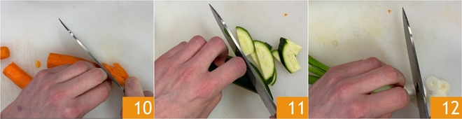Pelad y recortad las zanahorias, partidlas por la mitad a lo largo y cortadlas en rombos de un grosor de unos 3-4 mm 10. Haced lo mismo con los calabacines 11. Por último, laminad la cebolla tierna 12.