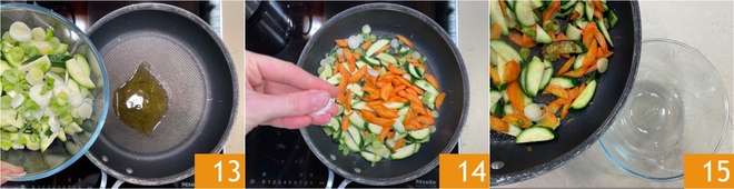 En una sartén antiadherente calentad un chorrito de aceite, añadid las verduras 13 y salteadlas a fuego fuerte durante unos minutos, salando ligeramente 14. Cuando estén doradas pero aún crujientes, apartadlas 15.