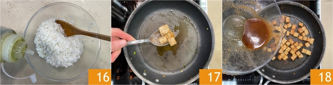 Mientras tanto el arroz estará cocido, así que escurridlo en un bol y aliñadlo con un chorrito de aceite 16. Sacad el tofu de la marinada y ponedlo en la misma sartén en la que cocinasteis las verduras 17, luego salteadlo un par de minutos a fuego alto hasta que esté bien dorado. En ese momento añadid también el líquido de la marinada 18 y un chorrito de agua, mezclad bien y retirad del fuego.