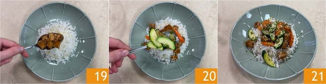 Estáis listos para emplatar: disponed el arroz en la base, luego añadid el tofu con su salsita 19 y las verduras 20. Rematad con semillas de sésamo negras y blancas y cebollino picado. ¡Vuestro arroz basmati con tofu a la soja y verduras salteadas está listo para disfrutar 21!