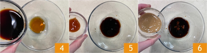 Añadid la salsa de soja 4, la salsa sriracha 5 y la mantequilla de cacahuete 6.