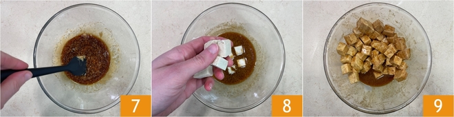 Mezclad bien la mezcla 7, luego añadid los cubitos de tofu 8 y mezcladlos con las manos para condimentarlos de forma uniforme 9. Dejadlos marinar mientras continuáis con el resto de la receta.