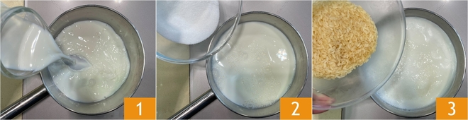 Para preparar el arroz con leche con frutas rojas, comienza vertiendo la leche 1 y el azúcar 2 en un cazo, mezcla y lleva a punto de hervir. En este momento, añade el arroz 3.