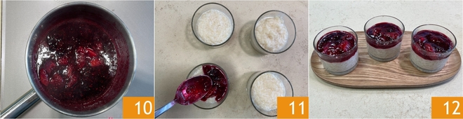 Cocina a fuego medio durante unos diez minutos 10. En este momento, recupera los vasitos del frigorífico y adorna la superficie con la salsa obtenida 11. ¡Tu arroz con leche con frutas rojas está listo para ser disfrutado 12!