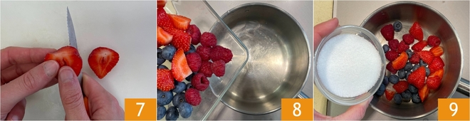 Mientras tanto, dedícate a la salsa de frutas rojas: lava las fresas y córtalas en trozos según su tamaño 7. Vierte las fresas, los arándanos y las frambuesas en un cazo 8 junto con el azúcar 9.