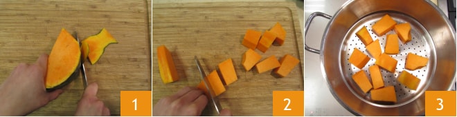 Como primer paso, comienza con la calabaza. Retira la piel 1, córtala en cubos de aproximadamente 3 cm 2 y colócala dentro de una vaporera 3.