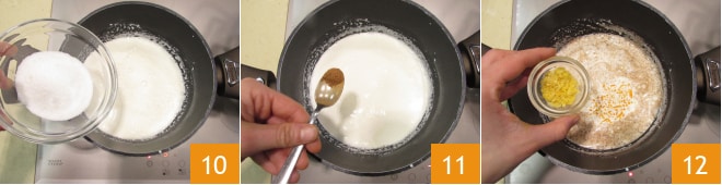 Agrega el azúcar 10 y mezcla con un batidor hasta disolver. Añade la canela 11, mezcla de nuevo, incorpora la piel de naranja y la de limón 12