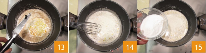 y por último, las semillas de la vaina de vainilla 13. Mezcla 14, espera unos segundos, luego añade la harina de arroz poco a poco 15, pero lentamente, continuando a mezclar para evitar grumos.