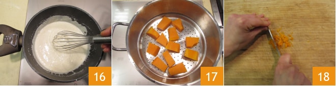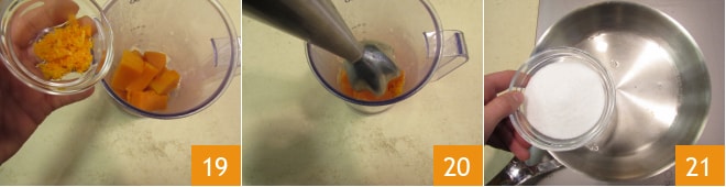 Sigue mezclando durante algunos segundos hasta que espese 16. Mantén la crema caliente, puedes optar por un baño maría, de esta manera permanecerá cremosa. A este punto, la calabaza estará lista 17, transfiere 200 g dentro de un contenedor con bordes altos y déjala enfriar. Ralla la piel de la naranja y pícala con un cuchillo hasta obtener una pulpa 18.
