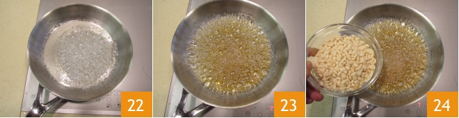 y deja caramelizar, mezclando con una cuchara de madera hasta que adquiera un color ámbar 22 23. Una vez listo, añade de golpe el arroz inflado 24