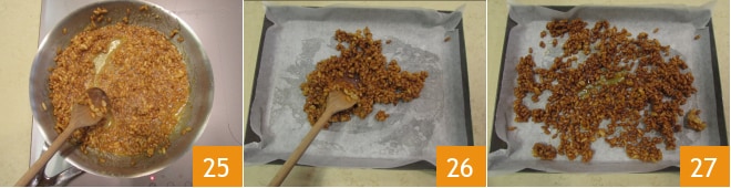 y mezcla sin parar, hasta que el caramelo cubra completamente el arroz inflado 25. Transfiere a una bandeja con papel de horno 26 y extiéndelo lo más posible 27.